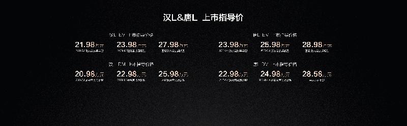 【小熊在线】比亚迪划时代旗舰汉L唐L已正式上市,推出汉L EV、汉L DM、唐L EV、唐L DM四大车系,并分别推出6大配置版本,售价为20.98万~28.98万元,强力冲击中高端市场。
