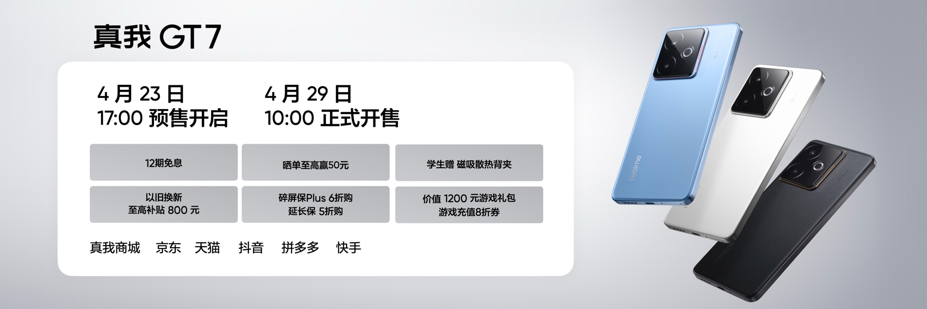真我GT7现已正式开启预售,4月29日10点全渠道现货开售,且价保618。购机可享至高12期免息分期,换新补贴最高800元,老用户以旧换新至高享200元额外补贴。