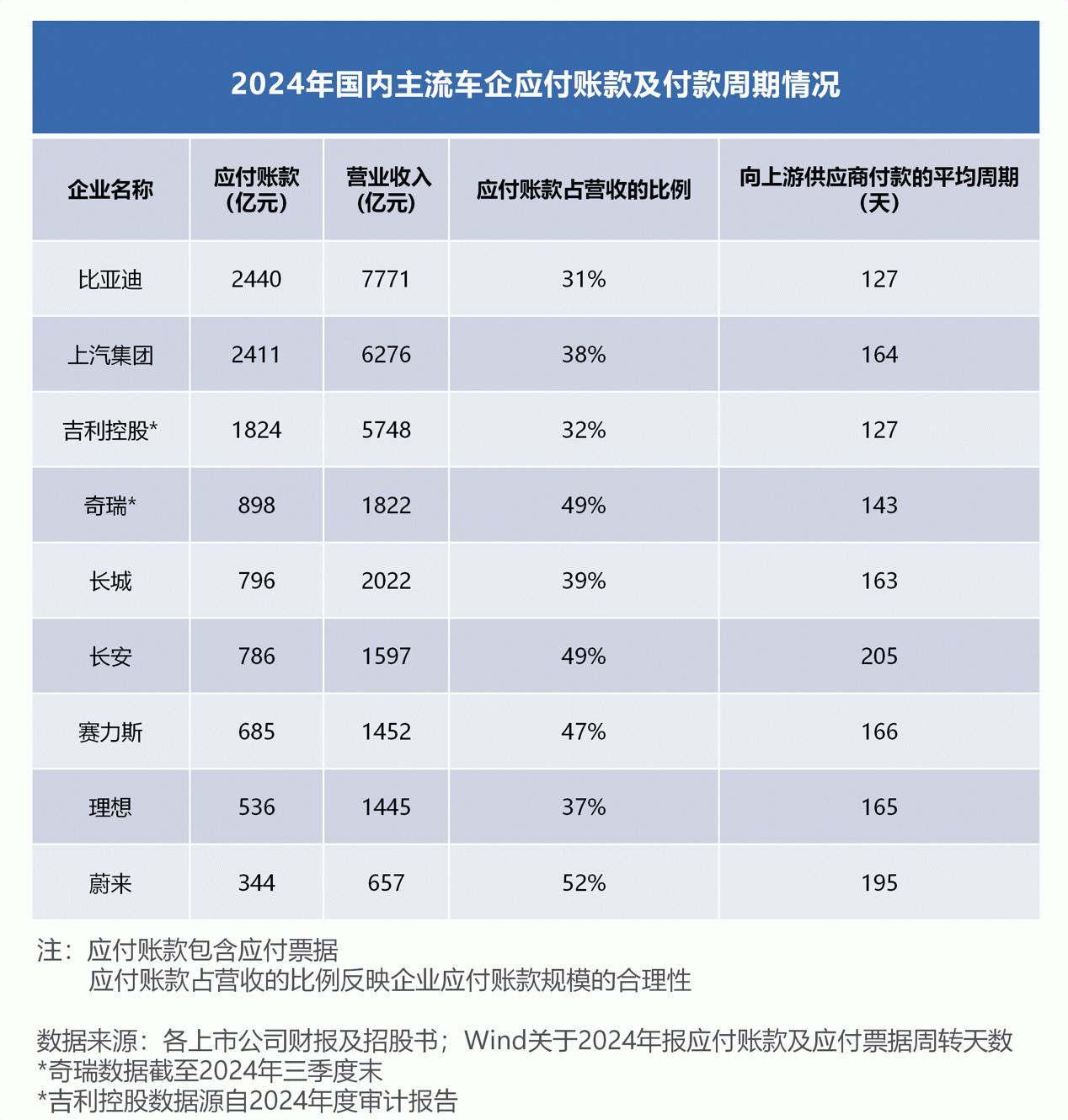 但事实上,比亚迪在中国汽车行业的付款周期并不算长。根据Wind数据,2024年,比亚迪向上游供应商付款的平均周期是127天,奇瑞为143天(截至三季度末),长城汽车是163天,蔚来是195天,长安则超过200天。