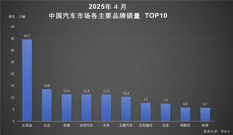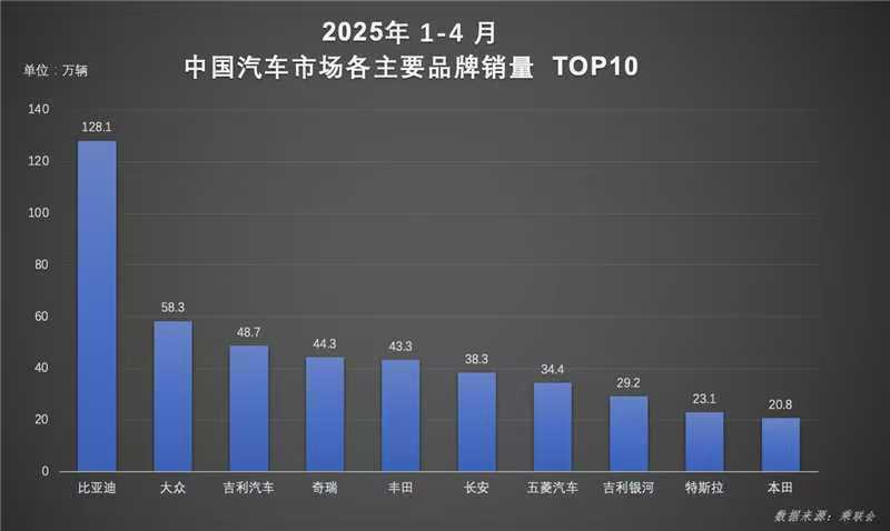 作为季度承上启下的关键节点,4月比亚迪汽车再次以34.7万辆的成绩,位列中国汽车市场各主要品牌销量TOP10第一,几乎等同于第二至四名之和;比亚迪汽车1-4月累计销量超128万辆,同比增幅显著,呈现出强劲的增长动力与市场统治力,展现头部品牌势能。