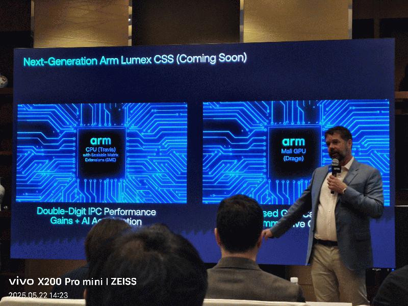 Arm 能够深入触及这些多元市场,正是得益于其 Armv9 架构——它已成为现代计算的基础。自四年前推出以来,全球多款最新的手机与 PC 都采用了 Armv9 CPU,为这些设备带来了更出色的 AI 性能。Arm 预计今年稍晚将推出新的 Armv9 旗舰 CPU(代号Travis)。它将带来双位数的性能提升,并通过最新的架构功能——可伸缩矩阵扩展 (Scalable Matrix Extension, SME),进一步加速处理 AI 工作负载。与此同时,Arm 下一代 GPU(代号 Drage)将能为长时间的游戏和更丰富的多媒体内容提供持续的性能支持。这两款产品的结合将引入面向移动端市场的 Arm Lumex CSS 解决方案,为未来消费电子设备上的边缘 AI 性能奠定基础。