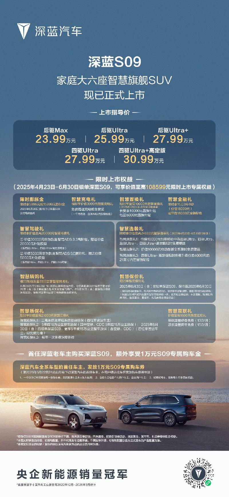 在价格与权益上,深蓝 S09 诚意满满。共推出 5 款配置,价格区间 23.99 万 - 30.99 万元。6 月 30 日(含)前购车用户,至高可享价值 108599 元的 10 大权益。叠加国补厂补,用户至高可享 3.5 万元综合补贴,新车到手价低至 20.49 万元起。此外,针对已下定其他大六座 SUV 的用户推出 “智慧转购礼”,并承诺 “一年保价”,消除用户对降价的顾虑。深蓝首任老车主还可另享 1 万元专属购车券。