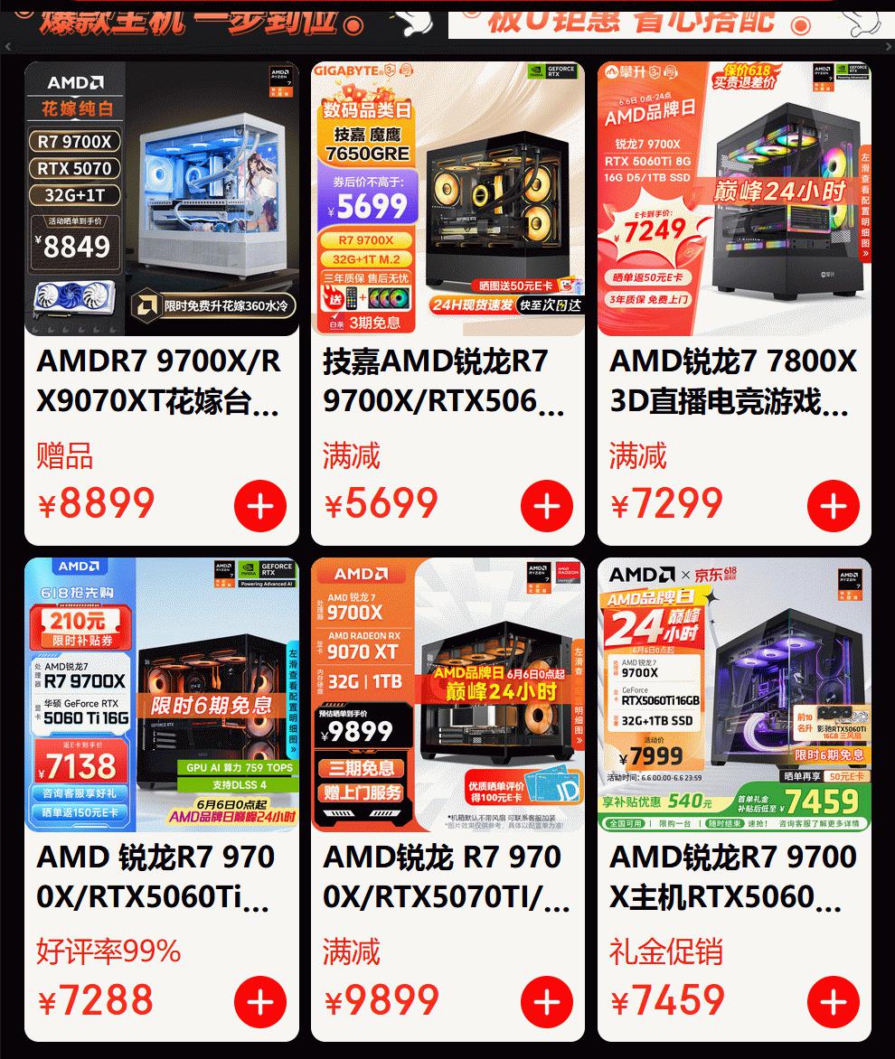 AMD京东自营旗舰店618大促日常阶段包含了全线DIY产品,不仅有全新的锐龙9000/9000X3D系列处理器,还有依旧热销的锐龙7000/7000X3D系列处理器和经典的锐龙5000系列处理器,同时还有和主板合作伙伴推出的板U套装超值搭配,让朋友们搭建自己全新的整机平台更加方便快捷。当然AMD还为不熟悉DIY攒机的用户们准备了多款整机产品,这些由各大装机品牌商使用锐龙处理器和Radeon显卡打造的整机产品不仅性能强劲,还都拥有极具品牌特色的外观,这些内外兼修的整机一定有一款可以满足大家的需要。
