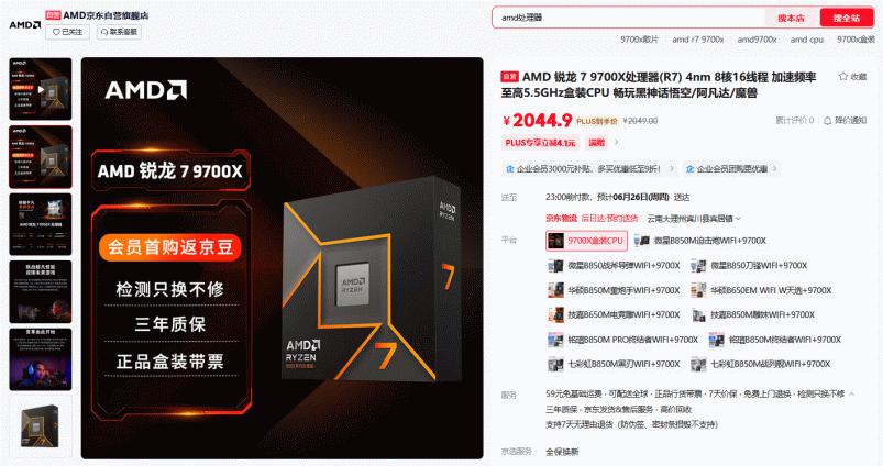 【小熊在线】虽然一年一度的京东商城618周年庆大促已经结束了,不过广大DIY用户选购硬件商品的热情还在继续着,特别是随着暑期的临近,相信攒机的热潮还会持续着。前一段大促期忘记下单的朋友也不用担心,AMD(超威)锐龙处理器的爆款产品依然有好价在促销中,今天就为大家推荐一款锐龙7 9700X处理器。