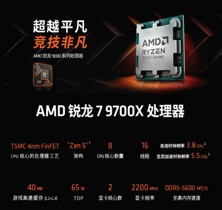 AMD 锐龙7 9700X处理器采用了TSMC 4nm FinFET工艺制程的ZEN5架构,搭配8核心16线程的配置和高达5.5GHz的最高频率,总计40MB的游戏缓存和65W的功耗设计非常适合主流玩家使用。AMD 锐龙9000系列处理器适用于AM5插槽,支持PCIe 5.0和DDR5内存,传输带宽较上一代翻倍,完美适配新一代显卡与超高速固态硬盘。AMD最新承诺这一代至少可以用到2027年+,大家可以放心“战未来”!