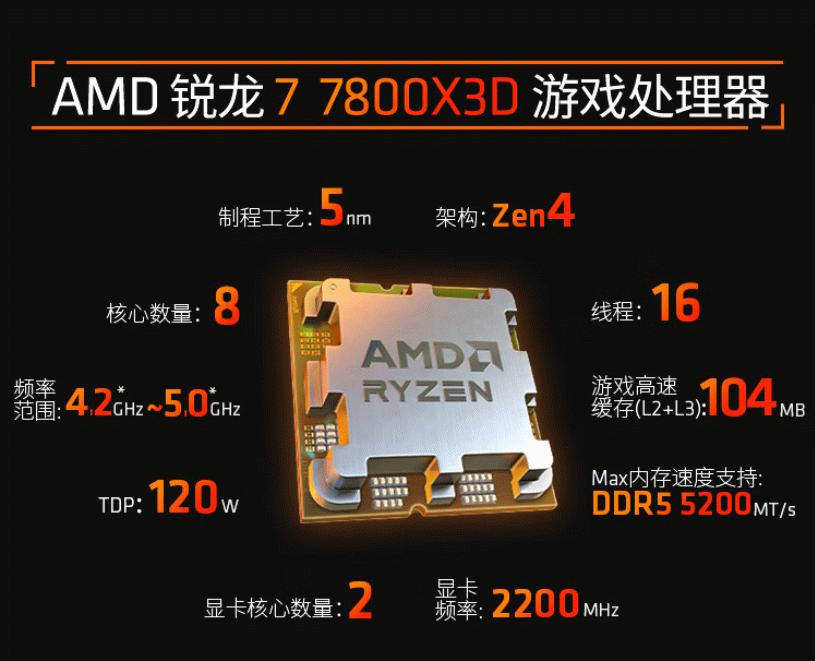 AMD 锐龙7 7800X3D处理器采用了业界领先的5nm工艺制程的ZEN4架构,配备了8核心16线程的配置,全核工作频率可达5.0GHz。锐龙7 7800X3D处理器适用于AM5插槽,支持PCIe 5.0和DDR5内存,让DIY玩家们直接进入AM5时代,AMD承诺这一代至少可以用到2027年+,让大家可以放心战未来。选购ZEN5架构锐龙处理器、DDR5内存与Gen5 SSD的组合,是目前PC硬件升级的终极答案。