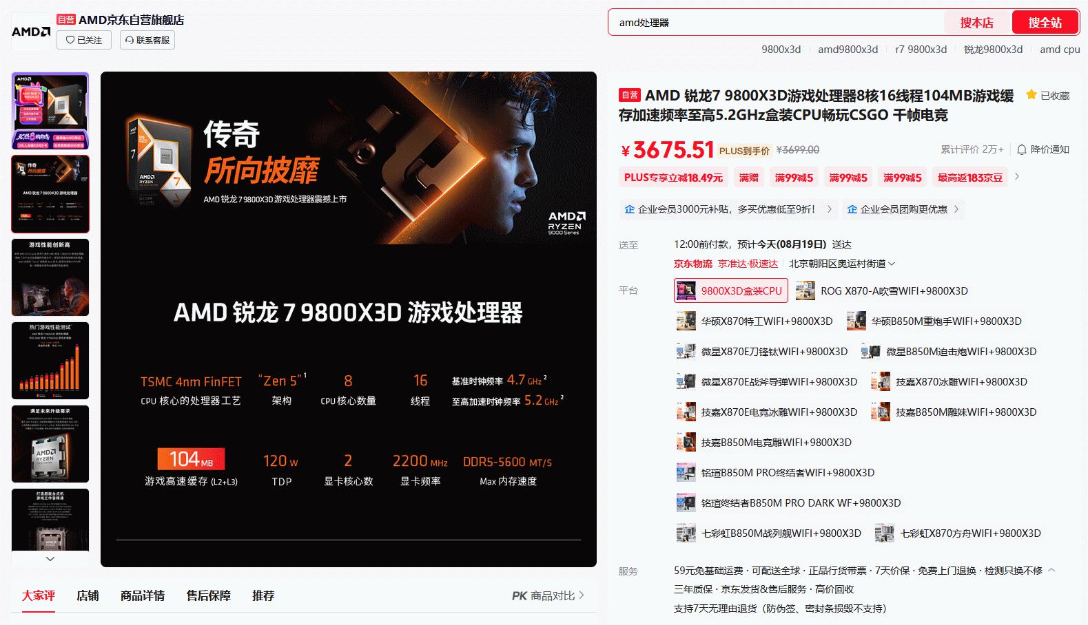 目前AMD 锐龙7 9800X3D处理器在京东自营旗舰店3C热8购物季的最新报价是3699元,京东PLUS会员到手更加优惠。成为京东旗舰店会员还有0元入会抽50元E卡,首购返666京豆和晒单抽AMD周边等活动。近期AMD 锐龙7 9800X3D处理器的价格较之前再下调200元,这样的降幅对于准备焕新攒的朋友们来说真是太给力了,强烈推荐给广大千帧游戏玩家!
