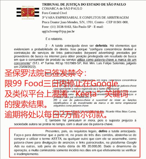 这是滴滴99Food继高价恶意购买“Keeta”广告词一案被圣保罗法院签发禁令后,再次因不正当竞争被起诉。当地时间8月11日,法院责令99Food三日内停止在Google及类似平台上混淆“Keeta”关键词搜索结果的行为,逾期将处以每日2万雷尔的罚款。