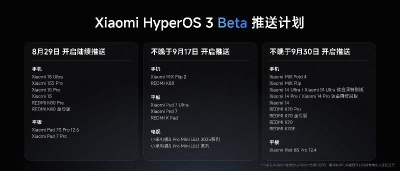 小米澎湃OS 3将于2025年8月29日为首批Beta机型开启陆续推送,覆盖Xiaomi 15系列、Xiaomi Pad 7S Pro 12.5、Xiaomi Pad 7 Pro、REDMI K80 Pro、REDMI K80 至尊版,并将陆续为更多机型开启推送。如需了解支持机型及具体计划,请持续关注小米官网及小米社区公告。
