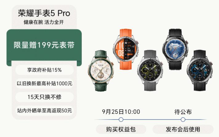 即日起参与荣耀手表5 Pro预约,可享受199元礼品表带免费送等5大权益!权益一,连带优惠,购买荣耀 Magic 全系列&荣耀折叠全系列用户,赠送200元通用权益(仅体验店)。权益二,购机礼赠,购荣耀手表5 Pro用户,赠送价值199元礼品表带。权益三,以旧换新,最高可补贴 1000 元(仅体验店)。权益四,分期免息,至高可享 12 期分期免息(仅线下)。权益五,只换不修,15天只换不修。