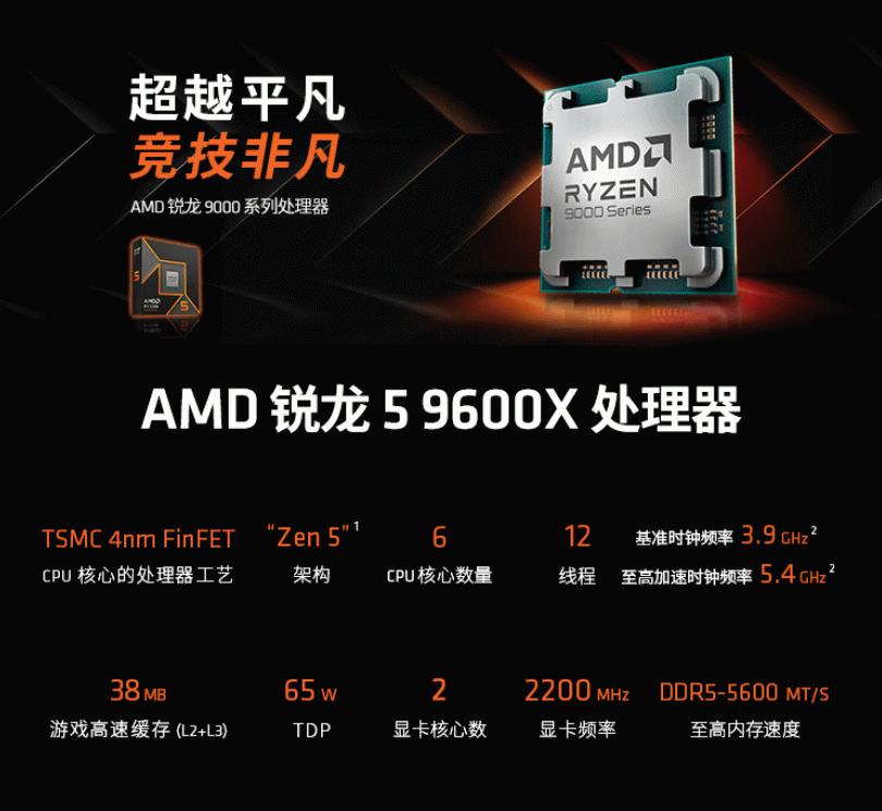 AMD锐龙5 9600X处理器采用了先进的TSMC 4nm FinFET工艺制程,搭配全新的Zen5架构。这一组合使得锐龙5 9600X在性能和能效上都有了显著提升。它拥有6核心12线程的配置,基础运行频率为3.9GHz,最高可加速至5.4GHz,这样的高频率能够确保处理器在面对复杂任务时依然能够游刃有余。AMD锐龙9000系列处理器适用于AM5插槽,支持PCIe 5.0和DDR5内存,AMD承诺这一代至少可以用到2027年+,让大家可以放心战未来。