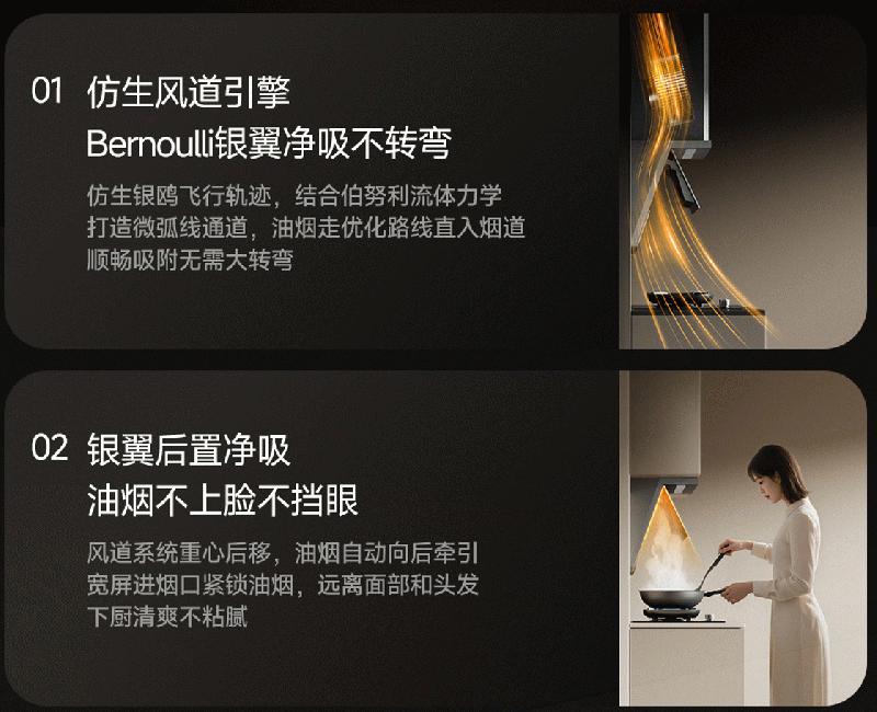当行业仍在比拼风量参数时,追觅选择从根源重构净烟逻辑。星穹净烟机搭载了首创的“银翼双擎净烟系统”,不再简单地将油烟向上吸排,而是运用伯努利流体力学原理,在325mm超薄机身内重构风道与叶轮结构。通过将风道重心后移,该系统能在炉灶上方形成独特的低压气旋,如同有一双无形之手,在油烟产生的瞬间即将其“向后牵引”,远离用户的面部与头发。