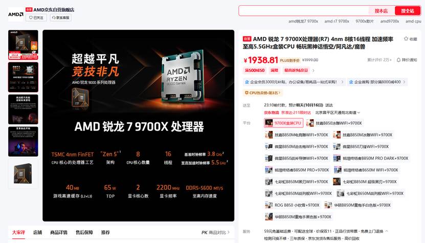 目前AMD 锐龙7 9700X处理器在京东自营旗舰店双十一促销预热阶段的最新报价是1999元,京东PLUS会员到手还能再优惠,成为京东旗舰店会员还有0元入会抽100元E卡,首购返666京豆和晒单送泡泡玛特盲盒还能抽AMD周边等活动。AMD 锐龙7 9700X处理器近期的价格已经来到了2000元以下,对于这样一款综合性能强劲的游戏处理来说真的非常超值,推荐大家随时入手。
