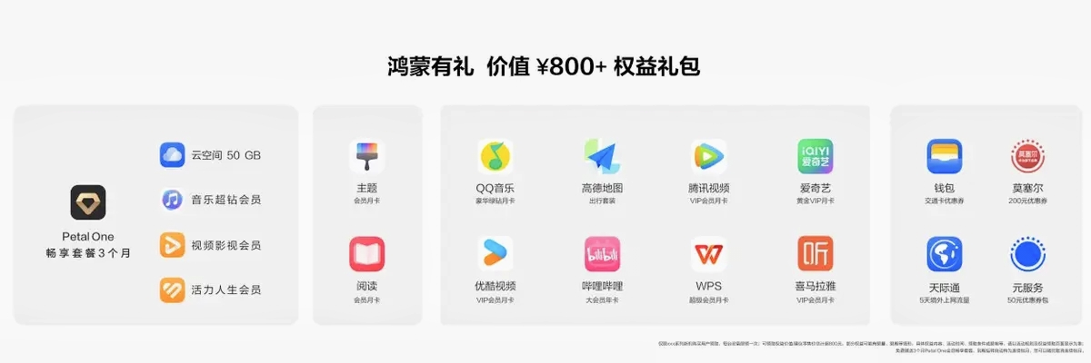 购买nova 14 活力版的用户,可专享价值超 800 元的“鸿蒙有礼”权益,不仅包含多重华为会员权益,同时专享多重三方top应用会员权益。包含哔哩哔哩大会员年卡、高德地图出行套装、腾讯视频VIP会员月卡、爱奇艺黄金VIP月卡、QQ音乐豪华绿钻月卡、优酷视频VIP月卡、WPS超级会员月卡、喜马拉雅VIP月卡,满足用户娱乐、购物、办公等全方位的需求。同时,购机用户还可购买综合保障服务产品HUAWEI Care+,包含两年期和一年期两种选择。