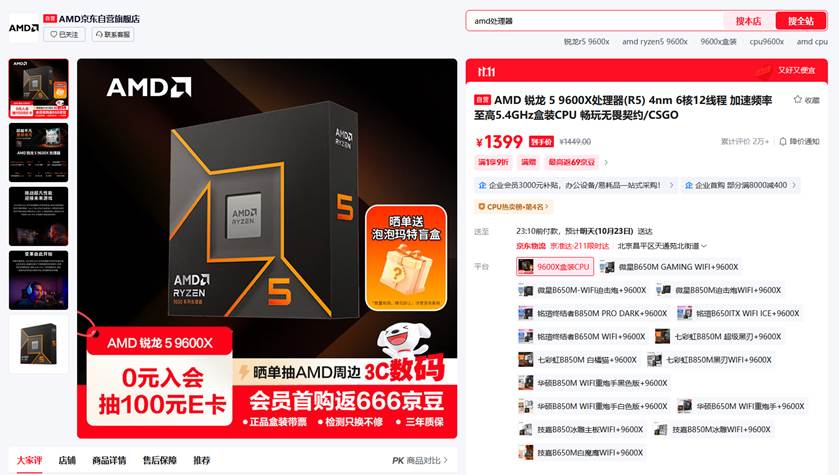 目前AMD 锐龙5 9600X处理器在在京东自营旗舰店11.11促销的最新报价是1399元,成为京东旗舰店会员还有0元入会抽100元E卡,首购返666京豆和晒单送泡泡玛特盲盒还能抽AMD周边等活动。目前AMD 锐龙5 9600X处理器的价格算是近期的最低售价了,想要攒机的朋友可以放心下单入手。