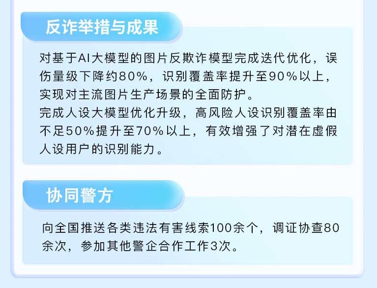 平台完成人设大模型优化升级,高风险人设识别覆盖率由不足50%提升至70%以上,有效增强了对潜在欺诈人设的提前预警和识别能力,将风险阻断在用户接触初期;