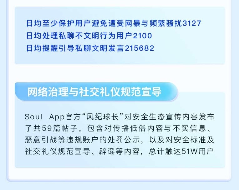 平台通过智能监测和快速处置流程,有效降低了用户遭受网暴和恶意攻击的概率。在Q3季度,Soul 致力于将善意社交“落地生根”,日均至少保护用户避免遭受网暴与频繁骚扰3127人,有效维护用户权益。同时,日均处理私聊不文明行为2100起,日均提醒引导私聊文明发言21.5万次,形成了主动干预和教育为主的治理闭环。