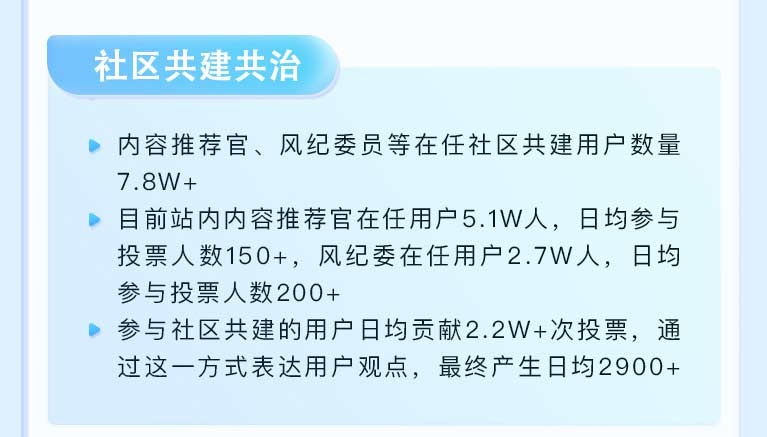 报告显示,内容推荐官、风纪委员等在任社区共建用户数量已超过7.8万人,其中,日均站内内容推荐官在任用户5.1万人,日均参与投票和投票人数均稳定增长。社区成员日均贡献2.2万+次投票,通过这一高度参与的方式,最终日均产生2900+个优质帖子,形成了“用户参与治理,治理反哺优质内容”的良性循环。