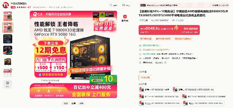 下面这款整机来自AMD的ESI合作伙伴宁美国度推出的游戏整机,它主要采用了炙手可热的AMD 锐龙7 9800X3D处理器打造,搭配了多款主流RTX 5000系列显卡,致力于为玩家们打造无与伦比的千帧游戏体验。目前这款整机不仅百亿补贴立减400元,同时可使用88VIP的9折无门槛消费券,还能享受分期12期免息的优惠,推荐给发烧游戏玩家入手。