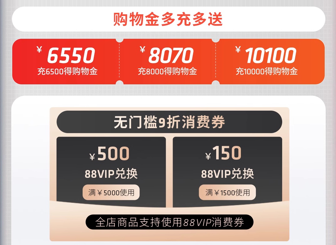 首先还是来介绍一下AMD天猫官方旗舰店的会员福利,强烈建议大家先加入AMD会员俱乐部,这样购物后获取的积分可以兑换好礼,首次入会还有无门槛券,专属客服顾问服务,还有不定时0.01元秒杀AMD周边好礼。而在双十一大促期间,AMD天猫官方旗舰店准备了购物金供大家充值,多充多送。淘宝88VIP会员可以领取无门槛9折消费券,满5000立减500元以及1500-150元。需要大家注意的是,这些产品的到手价格请以实际页面为准,很多福利活动限时限量,不清楚建议咨询下在线客服,下面来介绍活动商品。