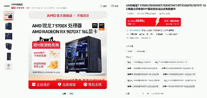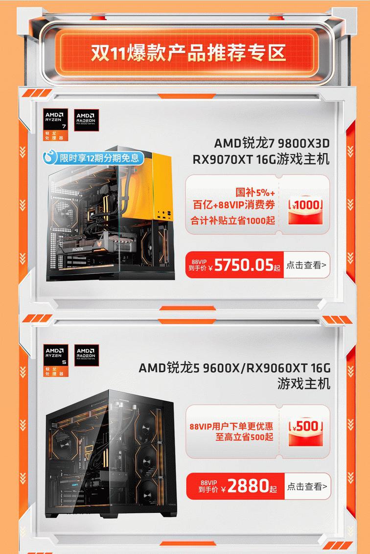 【小熊在线】今年天猫商城双十一大促在本周末即将进入白热化阶段,淘宝88VIP会员无门槛9折会员冲刺消费券已经发放,朋友们现在就是入手心仪好物的最佳时机了。对于DIY玩家们来说,能在大促期间给自己的电脑整机进行焕新或者升级都是非常明智的,因为接下来游戏厂商的年终大促也不远了,为了拥有更好体验现在来好好选购一下硬件商品是非常值得的。AMD(超威)天猫官方旗舰店已经备好了各种硬件单品和整机,朋友们赶快来活动页面了解一下吧!