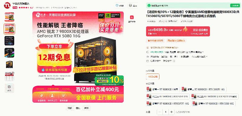 下面这款整机来自AMD的ESI合作伙伴宁美国度推出的游戏整机,它主要采用了炙手可热的AMD 锐龙7 9800X3D处理器打造,搭配了多款主流RTX 5000系列显卡,致力于为玩家们打造无与伦比的千帧游戏体验。目前这款整机不仅百亿补贴立减400元,消费券额外补贴付款立减10%,还能享受分期12期免息的优惠,推荐给发烧游戏玩家入手。
