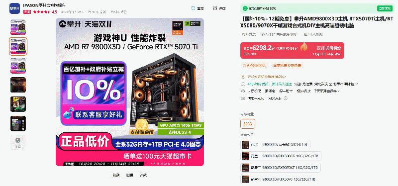 接下来这款同样来自AMD的ESI合作伙伴IPASON攀升出品的游戏整机,依然使用AMD 锐龙7 9800X3D处理器搭建,保证了游戏性能的最大化,主板、显卡、内存和SSD同样多种配置可选,玩家们可以根据需要来选配。目前这款整机的优惠力度非常大,综合算下来,国补+政府补贴立减10%搭配12期免息,支持淘金币晒单还送100元天猫超市卡,真的非常划算,推荐大家立刻入手。