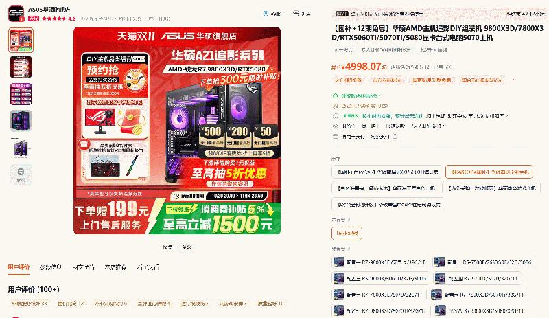 下面这款来自华硕旗舰店的整机就很简单粗暴了,大家主要选好自己想要的处理器就可以了,多款锐龙7000/9000处理器均可选择,主板、显卡和机箱都是来自华硕自有品牌的产品,性能保证坚若磐石。目前这款整机享受国补优惠,至高立减1500元,还有12期免息,下单还赠199元上门售后服务,非常贴心。