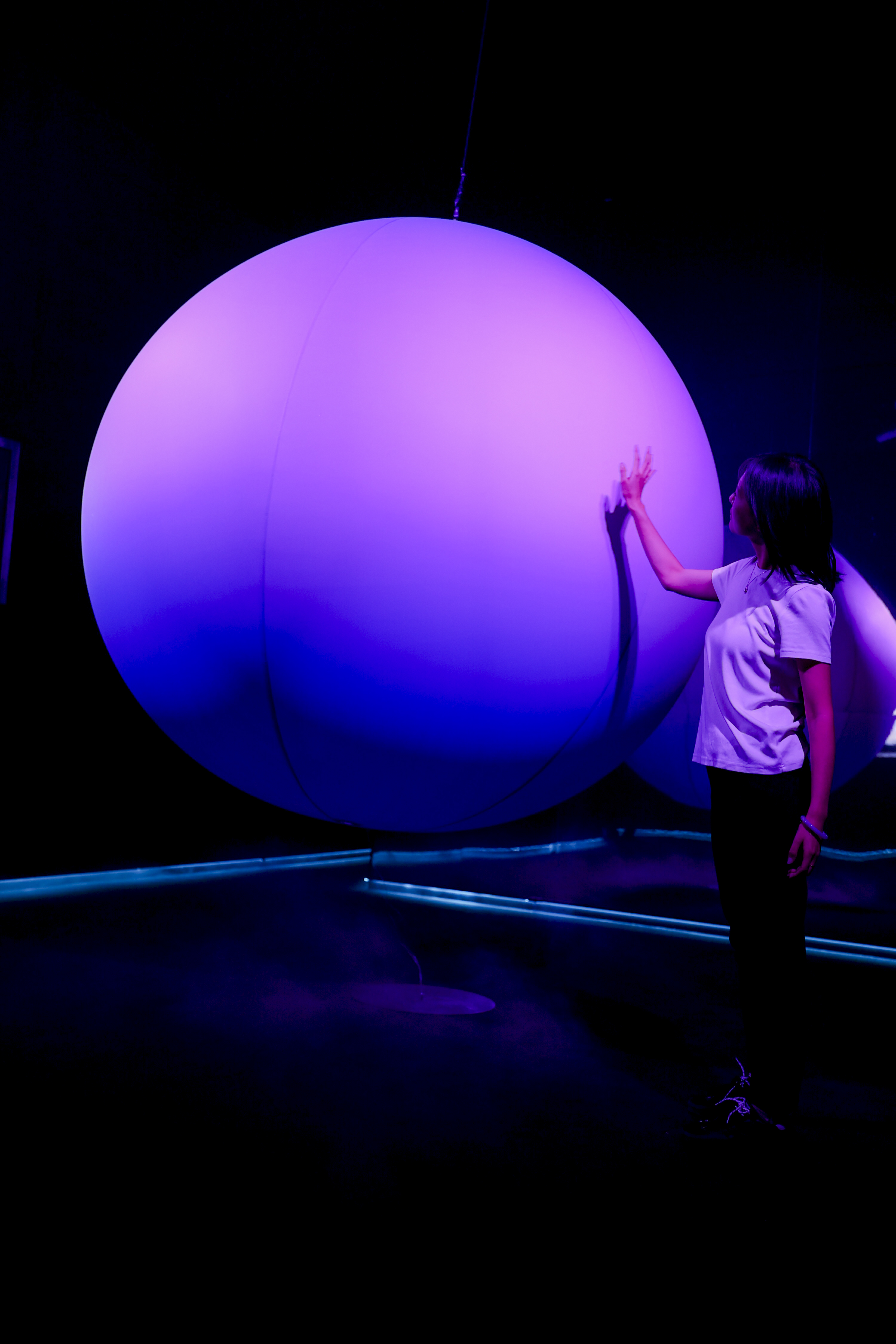 整个展览共设置三层展区。一层为影像艺术互动区,通过光影与影像的结合,为影像作品增添灵动和强烈的视觉呈现。二层是“文化遗产石窟”和“深海秘境”沉浸式观展体验区,“文化遗产石窟”的展区设计用纸艺重现了石窟场景,现场展示如唐代鎏金铁芯铜龙、商代戴金面罩青铜人头像等文物摄影作品,并通过投影的方式呈现,让参观者在虚实交错中完成一场跨越时空的文化对话;而在“深海秘境”体验区,借助光影技术,观众仿佛置身于神秘的海底世界,与水下生物进行一场亲密的对话。四层的展览内容则更加丰富,实景搭建的艺术风格花园美轮美奂,成为参观者争相打卡的梦幻背景;多面镜射的深空和沉浸式投影打造的极光海滩让人沉浸于“星穹咏叹”的视觉洗礼;更有那被大气中的尘埃粒子反散射形成的淡粉色光弧,这个反曙暮光也叫“维纳斯带",灰蓝的色带就是地球的影子。气膜材质灵感源于在观测时感受到的“天空的呼吸”,把无形的空气实体化。观众看到的不只是“固体”,也像空气在光中的显影。这标志了维纳斯带的生命性:轻盈、流动、随时间消散。球体仿佛在呼吸,回应着人类与大气之间最基本的连接,为到场的每一位观众献上一场真实可感的天文奇景。
