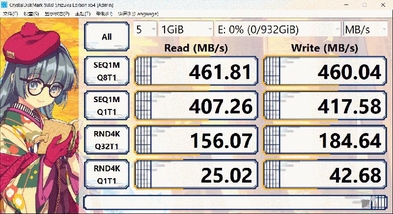 根据CrystalDiskMark测试结果,我们可以看到闪迪ELE移动固态硬盘在1GiB测试条件下,可以将顺序读取、顺序写入速度维持在460MB/s以上,大大超过了闪迪官方标称的传输能力,这个表现可以说是远超预期。