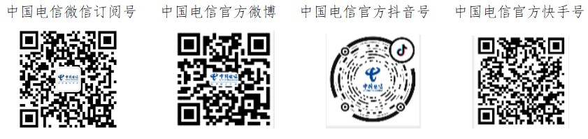 获取更多信息,请访问中国电信官方网站www.chinatelecom.com.cn或者关注“@中国电信”微信订阅号、官方微博、抖音和快手账号。