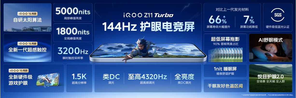 iQOO Z11 Turbo配备6.59英寸1.5K 144Hz护眼电竞屏,支持类DC调光、至高4320Hz超高频调光、全亮度类DC调光三重护眼方案,通过SGS硬件级低蓝光与低频闪认证,实现全天候、全人群、全场景护眼。